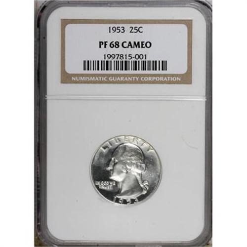 <B>1953 25C PR68 Cameo NGC.</B></I> NGC Census: (171/13). PCGS Population (32/1). Numismedia Wsl. Price for NGC/PCGS coin in PR68: $240. (#85985)<BR><BR><b>Shipping:</b> Coins & Currency (<a target="_blank" href="http://www.heritageauctions.com/common/shipping.php">view shipping information</a>\)