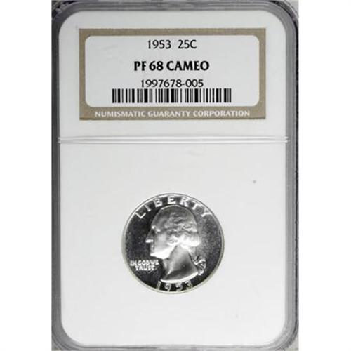 <B>1953 25C PR68 Cameo NGC.</B></I> NGC Census: (170/13). PCGS Population (0/0). Numismedia Wsl. Price for NGC/PCGS coin in PR68: $240. (#85985)<BR><BR><b>Shipping:</b> Coins & Currency (<a target="_blank" href="http://www.heritageauctions.com/common/shipping.php">view shipping information</a>\)