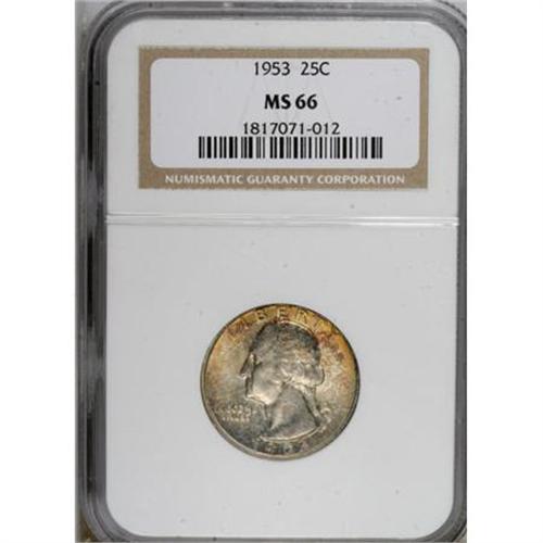 <B>1953 25C MS66 NGC.</B></I> NGC Census: (322/77). PCGS Population (258/31). Mintage: 18,500,000. Numismedia Wsl. Price for NGC/PCGS coin in MS66: $72. (#5852)<BR><BR><B>Coin Engraver:</B> John Flanagan<BR><BR><b>Shipping:</b> Coins & Currency (<a target="_blank" href="http://www.heritageauctions.com/common/shipping.php">view shipping information</a>)