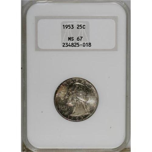 <B>1953 25C MS67 NGC.</B></I> NGC Census: (76/1). PCGS Population (31/0). Mintage: 18,500,000. Numismedia Wsl. Price for NGC/PCGS coin in MS67: $280. (#5852)<BR><BR><B>Coin Engraver:</B> John Flanagan<BR><BR><b>Shipping:</b> Coins & Currency (<a target="_blank" href="http://www.heritageauctions.com/common/shipping.php">view shipping information</a>)