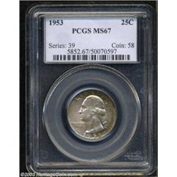 <table><tr><td><TABLE cellSpacing=0 cellPadding=0 width="100%" bgColor=#000000 border=0><TBODY> <TR><TD width="100%"><TABLE cellSpacing=1 cellPadding=3 width="100%" border=0><TBODY><TR><TD width="100%" bgColor=#79735c><FONT face=arial color=#ffffff size=3><B>Description</B> </FONT></TD></TR><TR><TD width="100%" bgColor=#ffffff><FONT face=arial size=2><B>1953 25C MS67 PCGS.</B></I> With 18 million coins produced, one would think that PCGS would have certified more than 17 examples of the 1953-P quarter. That is all, however, and this is certainly one of the most attractive coins extant. We say that not only because of this coin's exceptionally clean surfaces and bright, satiny mint luster, but also because of the light, speckled mauve and golden toning that sets this coin apart from its peers. </FONT></TD></TR></TBODY></TABLE></TD></TR></TBODY></TABLE><BR><A name=PricesRealized></A><TABLE cellSpacing=0 cellPadding=0 width="100%" bgColor=#000000 border=0><TBODY><TR><TD width="100%"><TABLE cellSpacing=1 cellPadding=3 width="100%" border=0><TBODY><TR><TD width="100%" bgColor=#79735c><A name=PR><FONT face=arial color=#ffffff size=3><B>Previous Prices from Heritage Auctions</B> </FONT></A></TD></TR><TR><TD bgColor=#f6f6ed><TABLE cellSpacing=0 cellPadding=0 width="100%" border=1><TBODY><TR><TD align=middle width="33%"><B>Date</B></TD><TD align=middle width="33%"><B>Service</B></TD><TD align=middle width="33%"><B>Price</B></TD></TR><TR bgColor=whitesmoke><TD width="33%"><B>02/11/2003</B></TD><TD width="33%">ANACS</TD><TD width="33%">$109.25</TD></TR><TR bgColor=whitesmoke><TD width="33%"><B>05/03/2003</B></TD><TD width="33%">PCGS</TD><TD width="33%">$2,530.00</TD></TR><TR bgColor=whitesmoke><TD width="33%"><B>03/01/2003</B></TD><TD width="33%">NGC</TD><TD width="33%">$115.00</TD></TR><TR bgColor=whitesmoke><TD width="33%"><B>04/27/2002</B></TD><TD width="33%">PCGS</TD><TD width="33%">$1,380.00</TD></TR><TR bgColor=whitesmoke><TD width="33%"><B>10/07/2001</B></TD><TD width="33%">NGC</TD><TD width="33%">$115.00</TD></TR><TR bgColor=whitesmoke><TD width="33%"><B>04/07/2001</B></TD><TD width="33%">NGC</TD><TD width="33%">$83.95</TD></TR></TBODY></TABLE></TD></TR><TR><TD bgColor=#ffffff><FONT face=arial size=1 ?>PLEASE NOTE: All prices realized reflect the final hammer price PLUS the buyer's premium in auctions that charge a buyer's premium. Each item has a notation at the top of the listing indicating whether that lot included a buyer's premium. Example: A item that sells with a final hammer price of $100 and a 20% buyer's premium will display with a price realized of $120. All information listed is intended to be as accurate as possible, but errors are possible. Please use this guide carefully and inform us of any inaccuracies. </FONT></TD></TR></TBODY></TABLE></TD></TR></TBODY></TABLE><BR><TABLE cellSpacing=0 cellPadding=0 width="100%" bgColor=#000000 border=0><TBODY><TR><TD width="100%"><TABLE cellSpacing=1 cellPadding=3 width="100%" border=0><TBODY><TR><TD width="100%" bgColor=#79735c colSpan=6><FONT face=arial color=#ffffff size=3><B>Price Guide*</B> </FONT></TD></TR><TR bgColor=#f6f6ed><TD align=middle><B>Grade</B> </TD><TD align=middle><B>Coin World<BR>(Trends)</B> </TD><TD align=middle><B>Numismedia<BR>Retail</B> </TD><TD align=middle><B>Numismedia<BR>Wholesale</B> </TD><TD align=middle><B>Coin<BR>Universe</B> </TD><TD align=middle><B>Heritage<BR>Value Index</B> </TD></TR><TR bgColor=#ffffff><TD align=middle>66</TD><TD align=right>---</TD><TD align=right>$90.00</TD><TD align=right>$72.00</TD><TD align=right>$135.00</TD><TD align=right>$112.25</TD></TR><TR style="FONT-WEIGHT: bold" bgColor=#cccfdd><TD align=middle>67</TD><TD align=right>---</TD><TD align=right>$280.00</TD><TD align=right>$224.00</TD><TD align=right>$1,500.00</TD><TD align=right>$1,050.00</TD></TR><TR bgColor=#ffffff><TD align=middle>68</TD><TD align=right>---</TD><TD align=right>---</TD><TD align=right>---</TD><TD align=right>---</TD><TD align=right>---</TD></TR><TR bgColor=#ffffff><TD colSpan=6><FONT size=1>*All information listed is intended to be as accurate as possible, but errors are possible. No item may be returned or refused based on this information which is provided as a service to our customers. You should contact each pricing source directly to determine the accuracy of this information. </FONT></TD></TR></TBODY></TABLE></TD></TR></TBODY></TABLE><BR><TABLE cellSpacing=0 cellPadding=0 width="100%" bgColor=#000000 border=0><TBODY><TR><TD width="100%"><TABLE cellSpacing=1 cellPadding=3 width="100%" border=0><TBODY><TR><TD width="100%" bgColor=#79735c><FONT face=arial color=#ffffff size=3><B>Population Guide</B> </FONT></TD></TR><TR bgColor=#ffffff><TD align=middle><!-- Begin Output of Population Grid--><TABLE cellSpacing=0 cellPadding=0 width="100%" border=0><TBODY><TR><TD vAlign=center><TABLE cellSpacing=0 width="100%" border=1 cellsadding="3"><TBODY><TR><TD vAlign=center><TABLE cellSpacing=0 cellPadding=3 width="100%" border=1><TBODY><TR><TD vAlign=center align=middle bgColor=#f0f1e8 colSpan=2 <CENTER><FONT face=Arial size=2><B>PCGS Pop </B></FONT><CENTER></CENTER></TD><TD vAlign=center align=middle bgColor=#f0f1e8 colSpan=2><CENTER><FONT face=Arial size=2><B>NGC Pop</B></CENTER></FONT></TD></TR><TR><TD vAlign=center><FONT face=Arial size=2>(67)</FONT> </TD><TD vAlign=center align=right><FONT face=Arial size=2>18</FONT> </TD><TD vAlign=center><FONT face=Arial size=2>(67)</FONT> </TD><TD vAlign=center align=right><FONT face=Arial size=2>65</FONT> </TD></TR><TR><TD vAlign=center><FONT face=Arial size=2>(>67)</FONT> </TD><TD vAlign=center align=right><FONT face=Arial size=2>0</FONT> </TD><TD vAlign=center><FONT face=Arial size=2>(>67)</FONT> </TD><TD vAlign=center align=right><FONT face=Arial size=2>1</FONT> </TD></TR></TBODY></TABLE></TD></TR></TBODY></TABLE></TD></TR></TBODY></TABLE><!-- End Output of Population Grid--></TD></TR></TBODY></TABLE></TD></TR></TBODY></TABLE><BR><TABLE cellSpacing=0 cellPadding=0 width="
