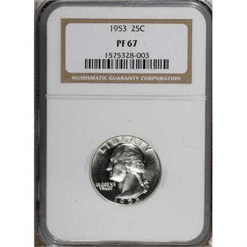 <B>1953 25C PR67 NGC.</B></I> NGC Census: (292/282). PCGS Population (499/81). Mintage: 128,800. Numismedia Wsl. Price for NGC/PCGS coin in PR67: $55. (#5985)<BR><BR><B>Coin Engraver:</B> John Flanagan<BR><BR><b>Shipping:</b> Coins & Currency (<a target="_blank" href="http://www.heritageauctions.com/common/shipping.php">view shipping information</a>\)