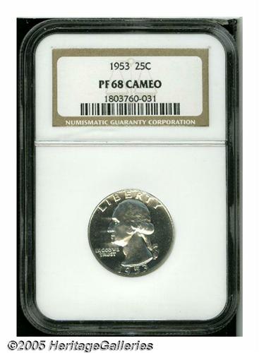 <B>1953<25C> PR68 Cameo NGC.</B></I> A beautiful proof Quarter that has deeply frosted devices and jet black fields. Marvelously preserved.