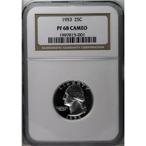 1953 25C PR68 Cameo NGC. A frosty and essentially unto