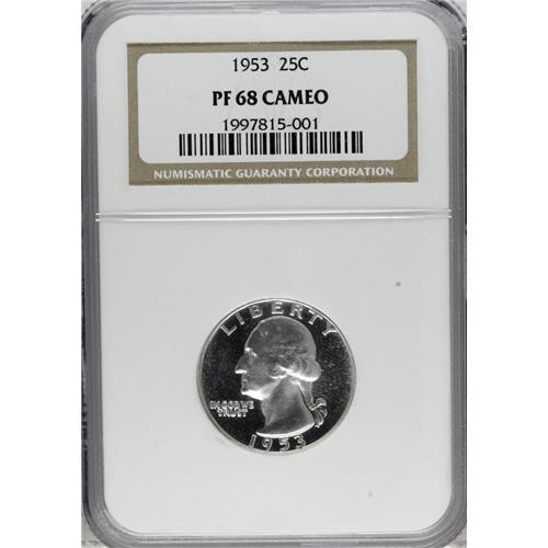 1953 25C PR68 Cameo NGC. A frosty and essentially unto