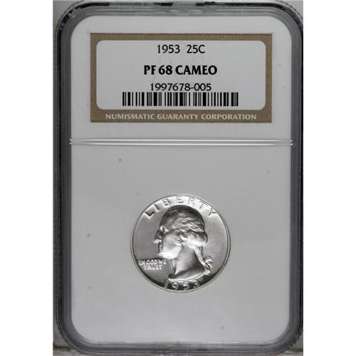 <B>1953 25C PR68 Cameo NGC.</B></I> NGC Census: (170/13). PCGS Population (0/0). Numismedia Wsl. Price for NGC/PCGS coin in PR68: $240. (#85985)<BR><BR><b>Shipping:</b> Coins & Currency (<a target="_blank" href="http://www.heritageauctions.com/common/shipping.php">view shipping information</a>)