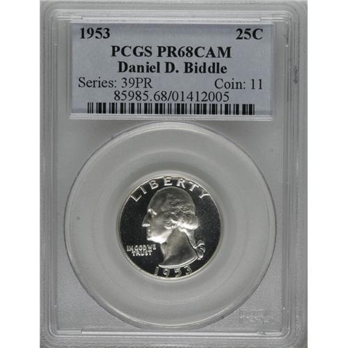 <B>1953 25C PR68 Cameo PCGS.</B></I> Ex: Daniel D. Biddle. PCGS Population (0/0). NGC Census: (170/13). Numismedia Wsl. Price for NGC/PCGS coin in PR68: $240. (#85985)<BR><BR><b>Shipping:</b> Coins & Currency (<a target="_blank" href="http://www.heritageauctions.com/common/shipping.php">view shipping information</a>)