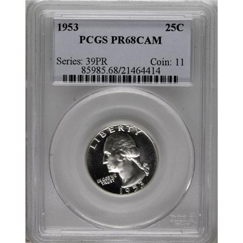 <B>1953 25C PR68 Cameo PCGS.</B></I> PCGS Population (29/1). NGC Census: (170/13). Numismedia Wsl. Price: $240. (#85985)<BR><BR><b>Shipping:</b> Coin/Currency (<a target="_blank" href="http://www.heritageauctions.com/common/shipping.php">view shipping information</a>)