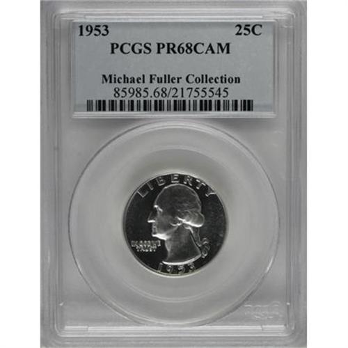 <B>1953 25C PR68 Cameo PCGS.</B></I> The immaculate surfaces exude full brilliance. Fully struck and seemingly pristine on both sides. A stark white-on-black appearance characterizes the appearance of this beautiful proof specimen. Population: 33 in 68 Cameo, 1 finer (10/07). <BR><I>From The Michael Fuller Collection.</B></I><BR><BR><b>Shipping:</b> Coins & Currency (<a target="_blank" href="http://www.heritageauctions.com/common/shipping.php">view shipping information</a>)
