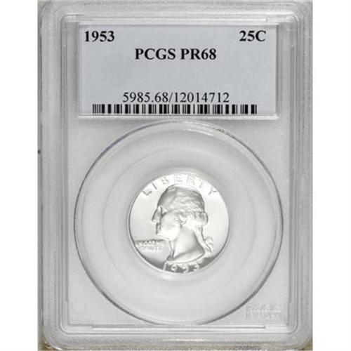<B>1953 25C PR68 PCGS.</B></I> PCGS Population (82/0). NGC Census: (276/7). Mintage: 128,800. Numismedia Wsl. Price for NGC/PCGS coin in PR68: $84. (#5985)<BR><BR><B>Coin Engraver:</B> John Flanagan<BR><BR><b>Shipping:</b> Coins & Currency (<a target="_blank" href="http://www.heritageauctions.com/common/shipping.php">view shipping information</a>)