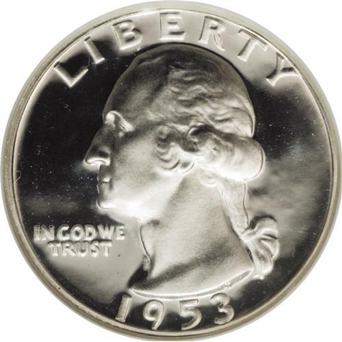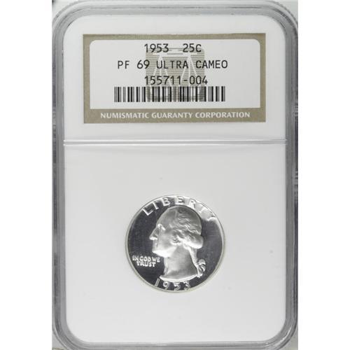 <B>1953 25C PR69 Ultra Cameo NGC.</B></I> A magnificent representative with breathtaking contrast and flawless untoned mirrors. Only a minuscule portion of 1953 proof production possesses deep cameo contrast, typically the first few strikes from well prepared proof dies. The single finest certified, since PCGS has not surpassed the PR68 Deep Cameo level. Population: 1 in 69 Ultra Cameo, 0 finer (11/06).<BR><BR><b>Shipping:</b> Coin/Currency (<a target="_blank" href="http://www.heritageauctions.com/common/shipping.php">view shipping information</a>)