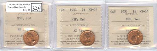 3 x 1953 ICCS certified No Shoulder Fold; Red. Lot of 3 coins.