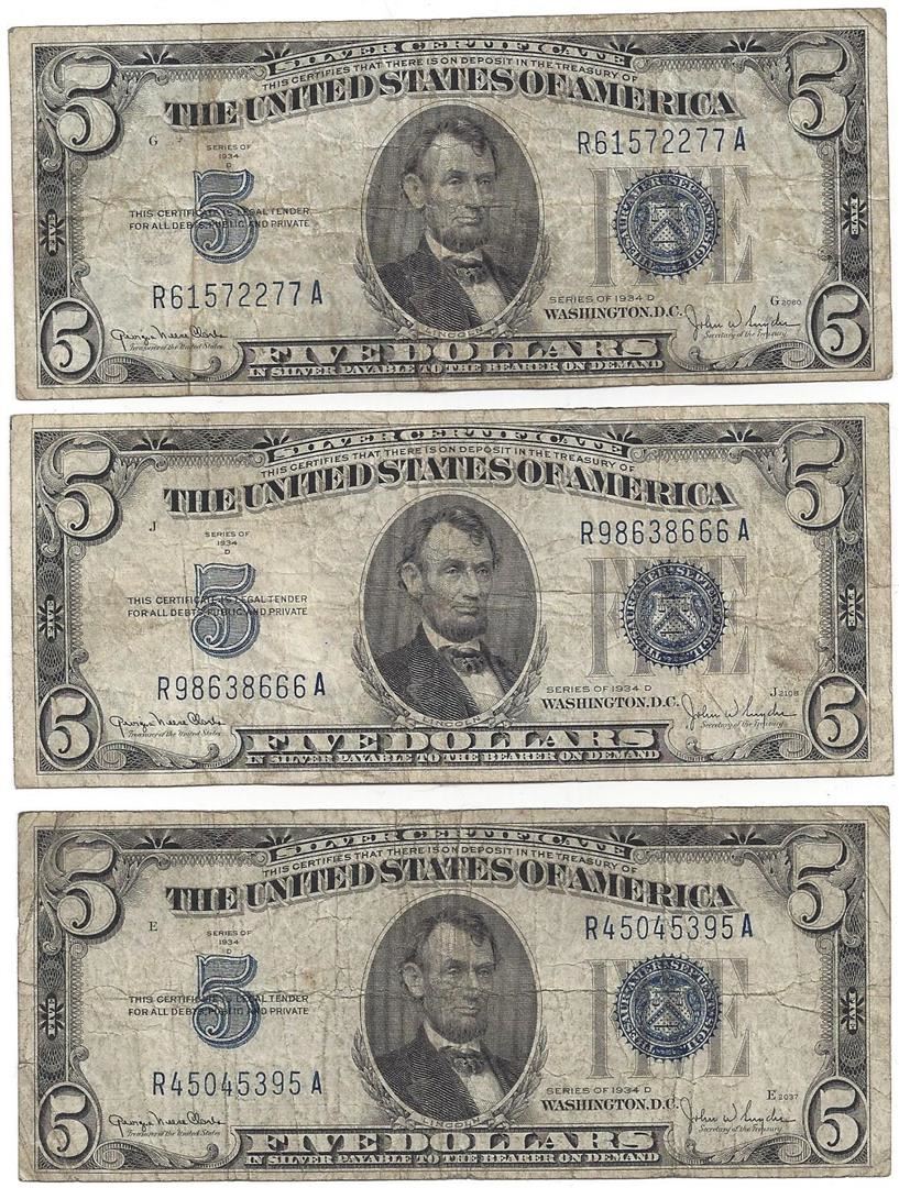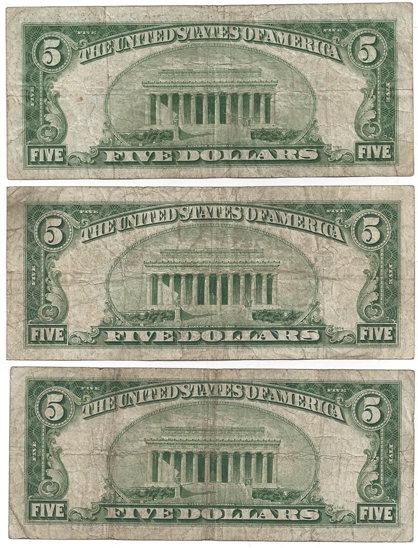 1953 $5 Bill Currency Lot of 3.