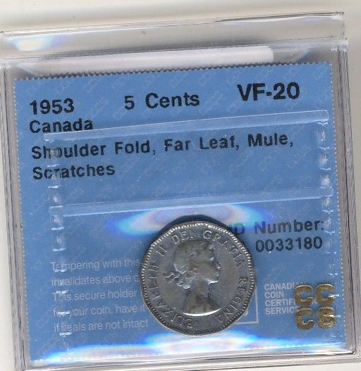1953 5 Cents; SF FL Mule CCCS VF20. Scratches.