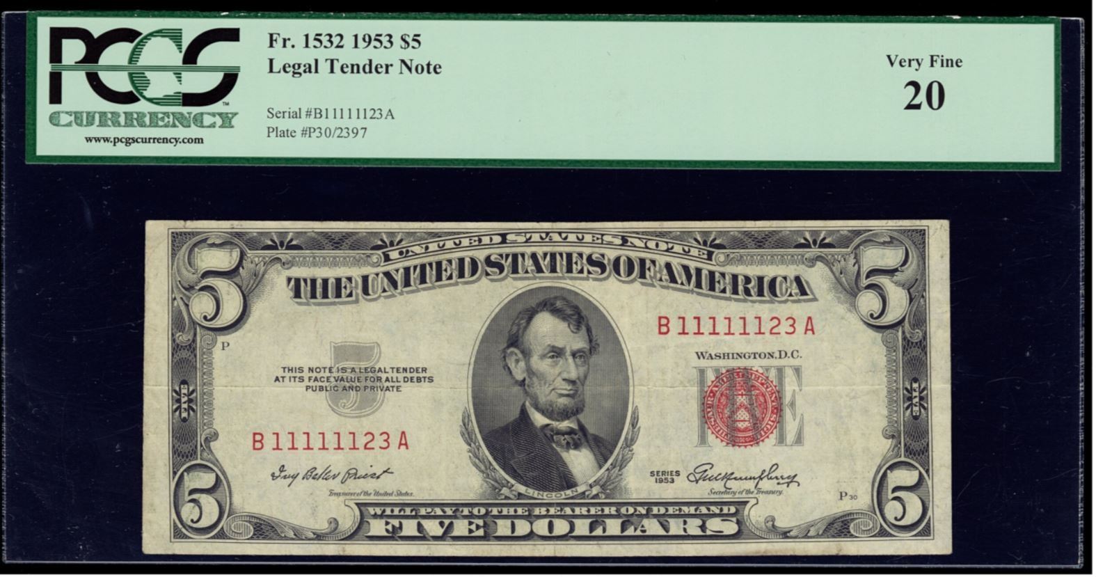 One 1953 $5 Fancy Serial Legal Tender PCGS 20.