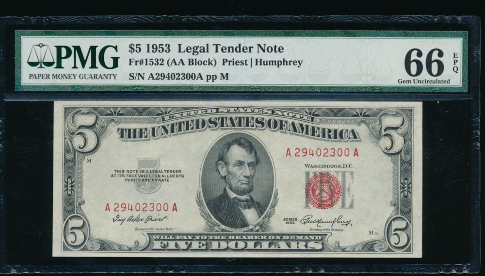 One 1953 $5 Legal Tender Note PMG 66EPQ.