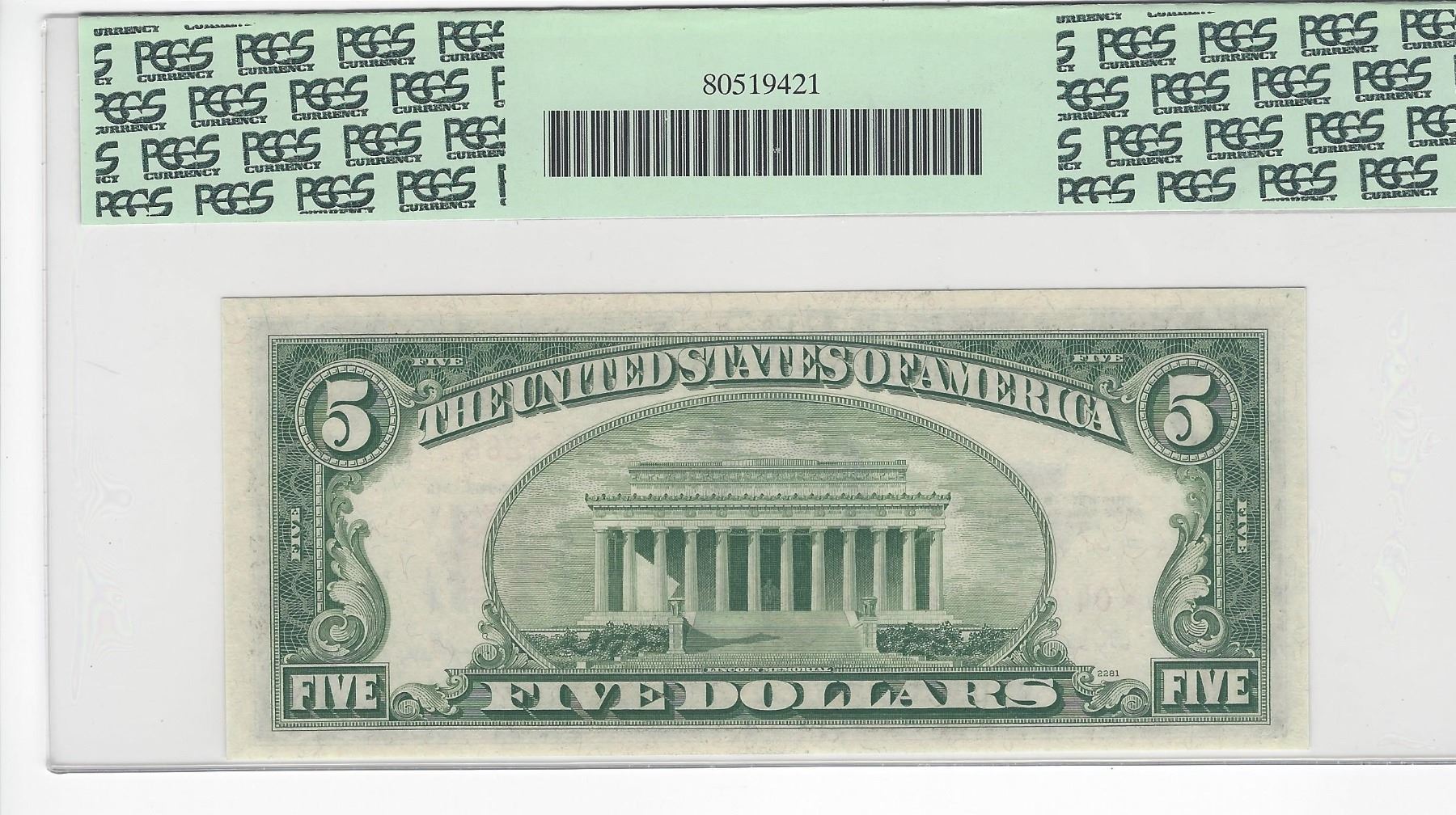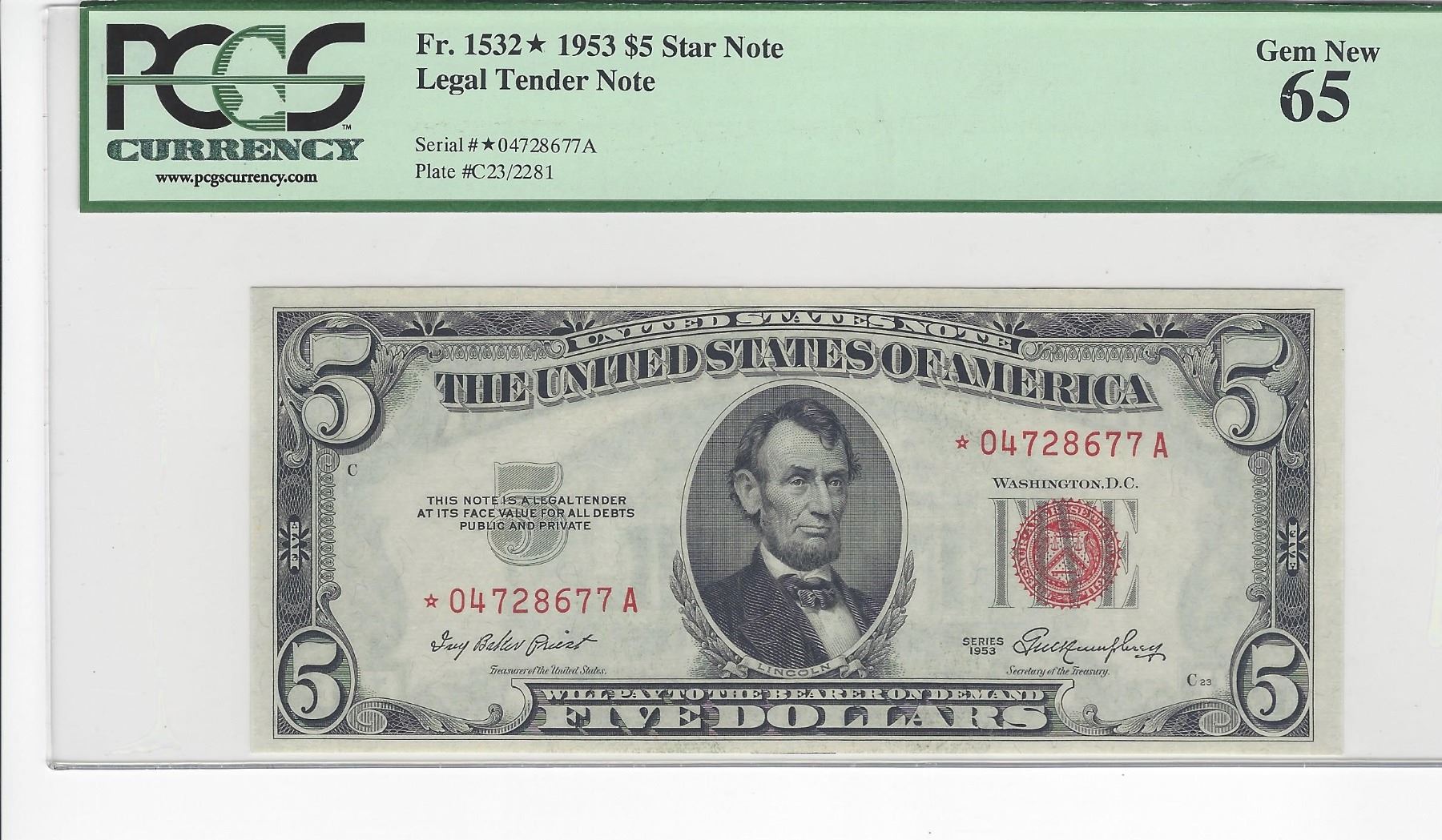 Excellent 1953 STAR $5 Legal Tender replacement note. Graded 65 PPQ Gem New. The note is well centered and the embossing and ink pops off the notes.