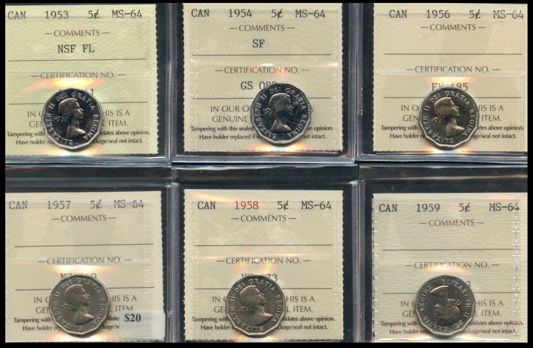 1953 5¢ NSF FL, 1954, 1956, 1957, 1958, 1959 & 1960 all ICCS Choice Mint State-64. Lot of 7 coins
