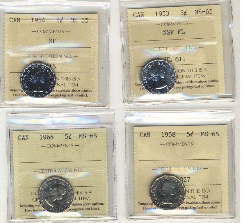 1953 5¢ NSF FL, 1954 SF, 1958 & 1964 ICCS MS65. Lot of 4 coins.