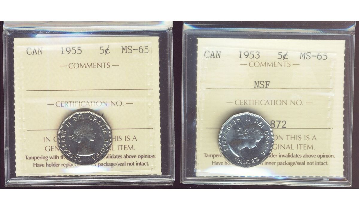 1953 5¢ NSF FL & 1955 ICCS MS65. Lot of 2 coins.