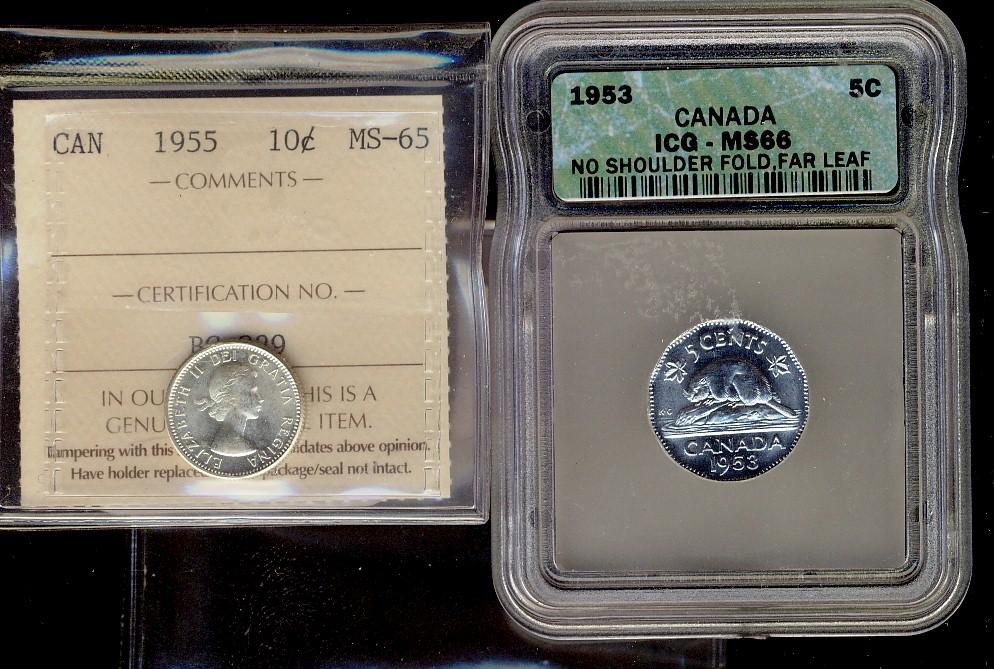 1953 5¢ NSF ICG MS66 & 1955 10¢ ICCS MS65. Lot of two Gem mintstate coins.