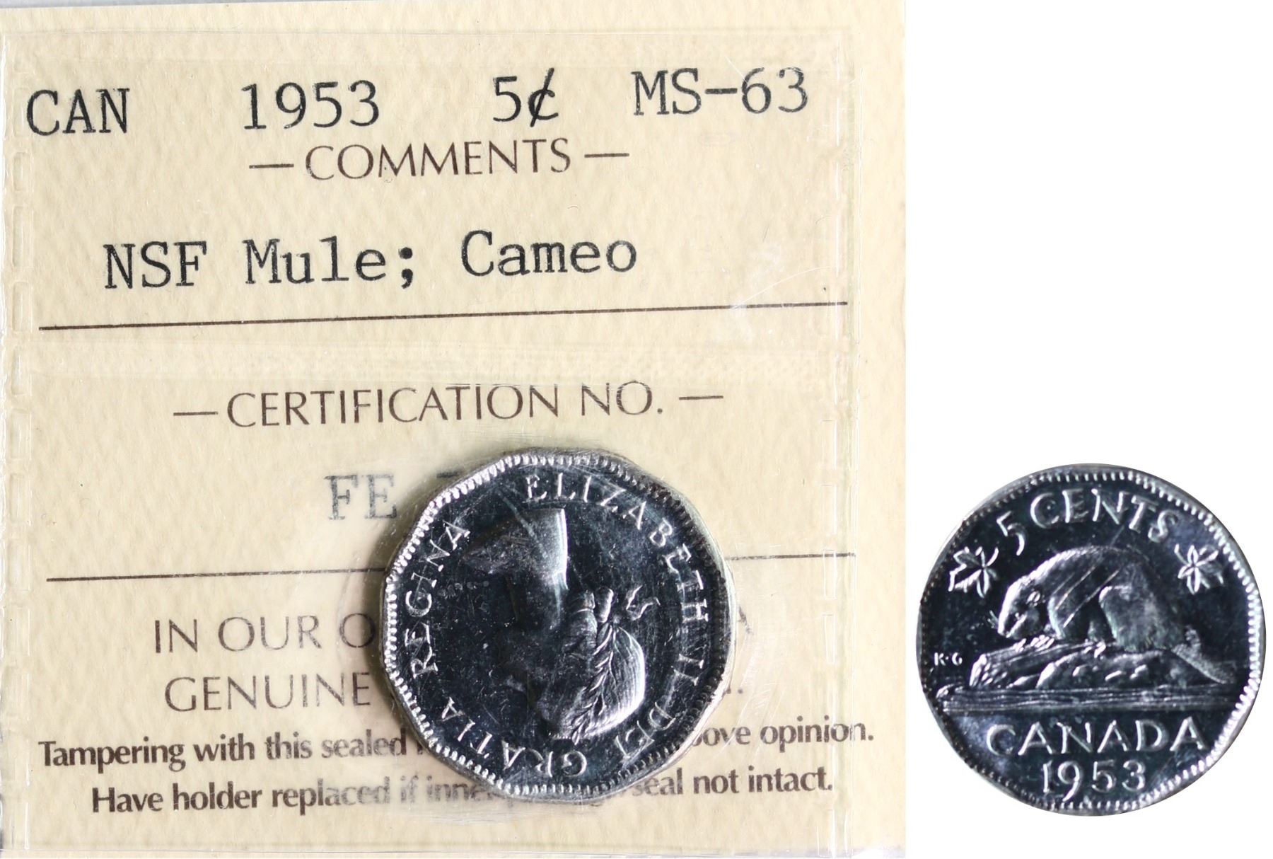 1953 5¢ "NSF - Near 9 - Mule" ICCS Choice Mint State-63 Cameo. Very scarce variety seldom seen and offered in this condition.