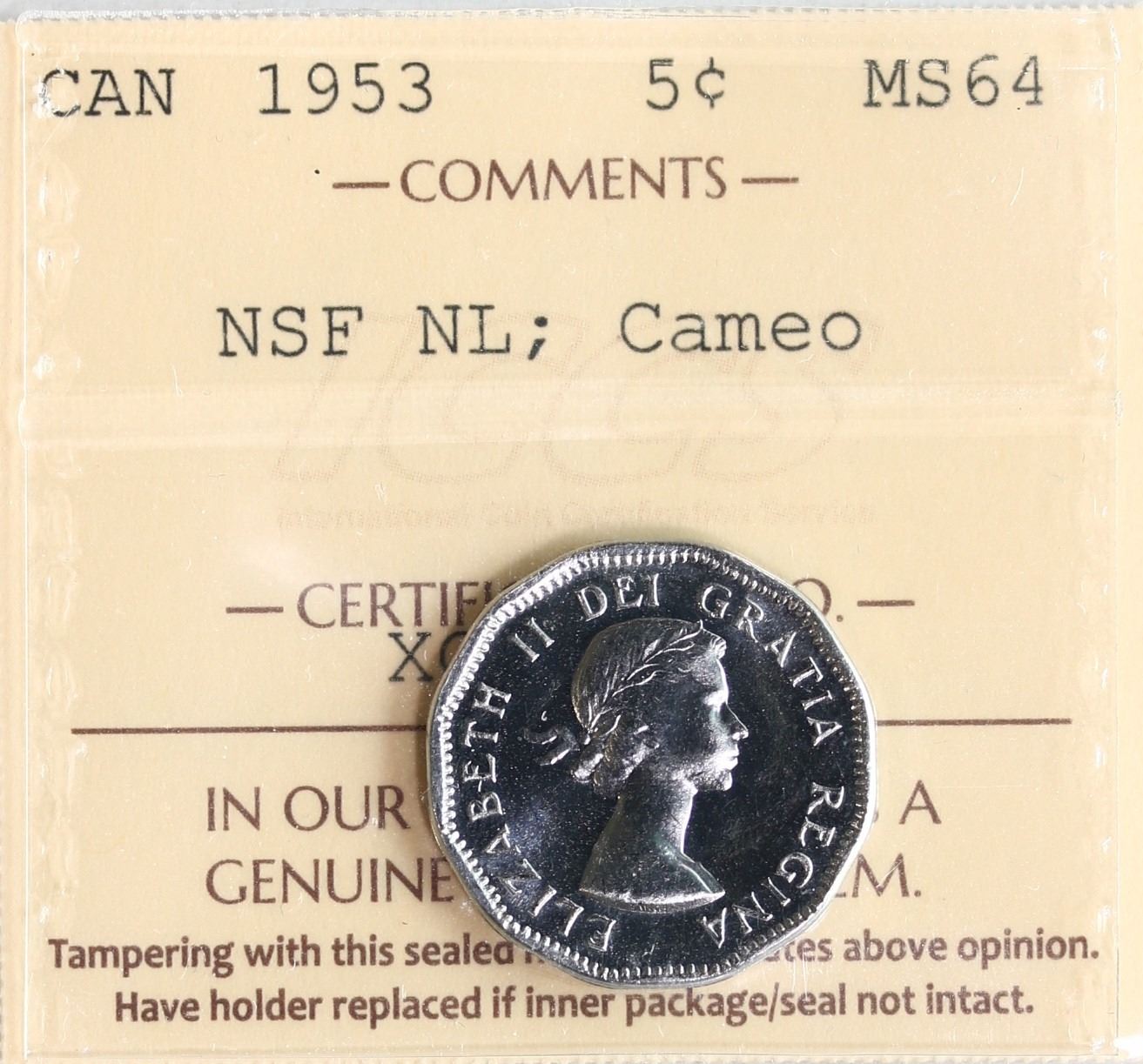 1953 5¢ "NSF - Near 9 - Mule" ICCS Very Choice Mint State-64 Cameo. A nice Mule example with a Cameo finish. Great opportunity to acquire this sought after variety.