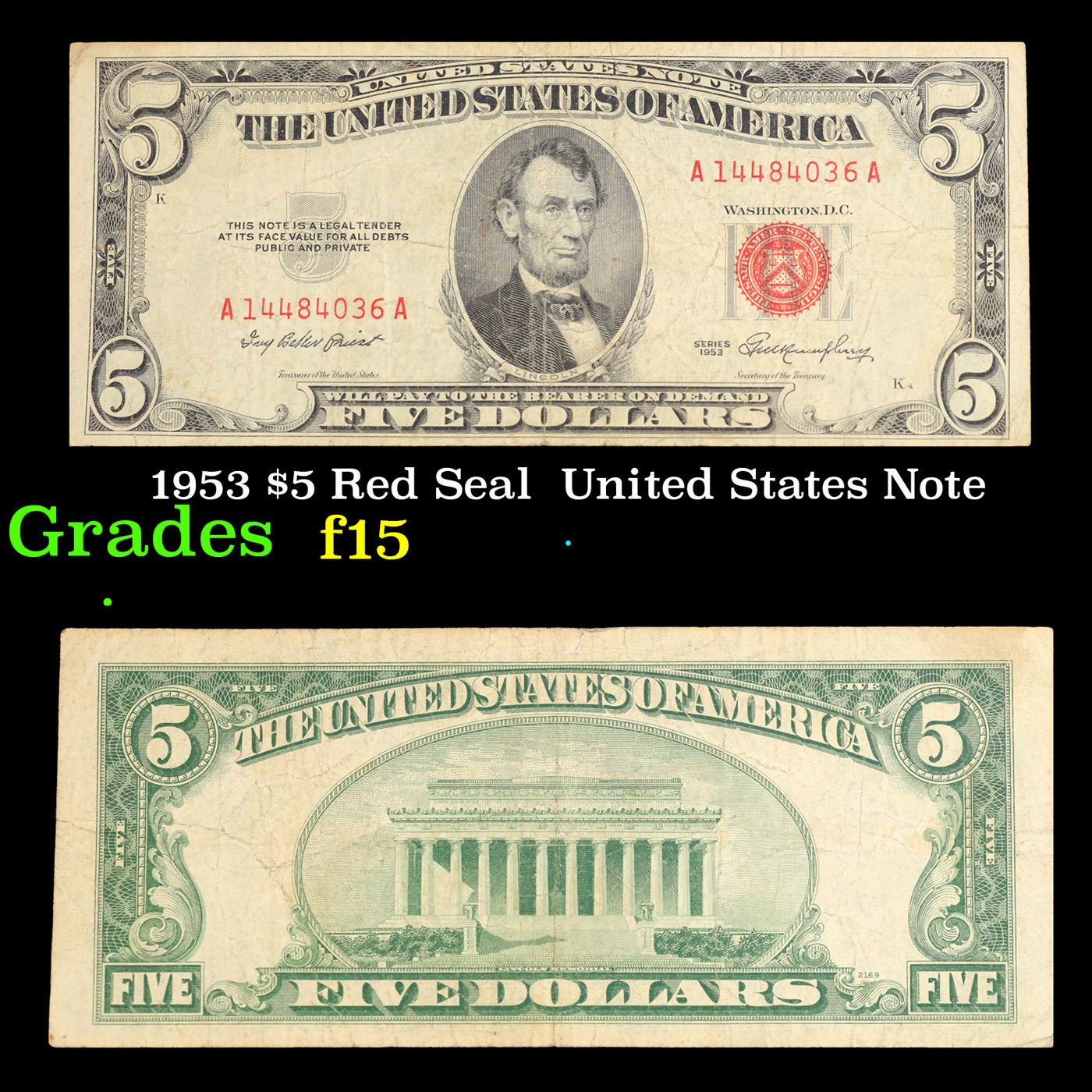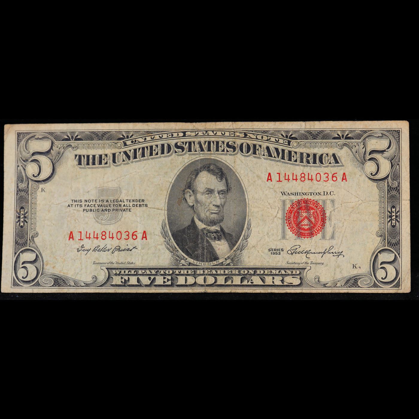 1953 $5 Red Seal Fancy Serial United States Note Grades f+.