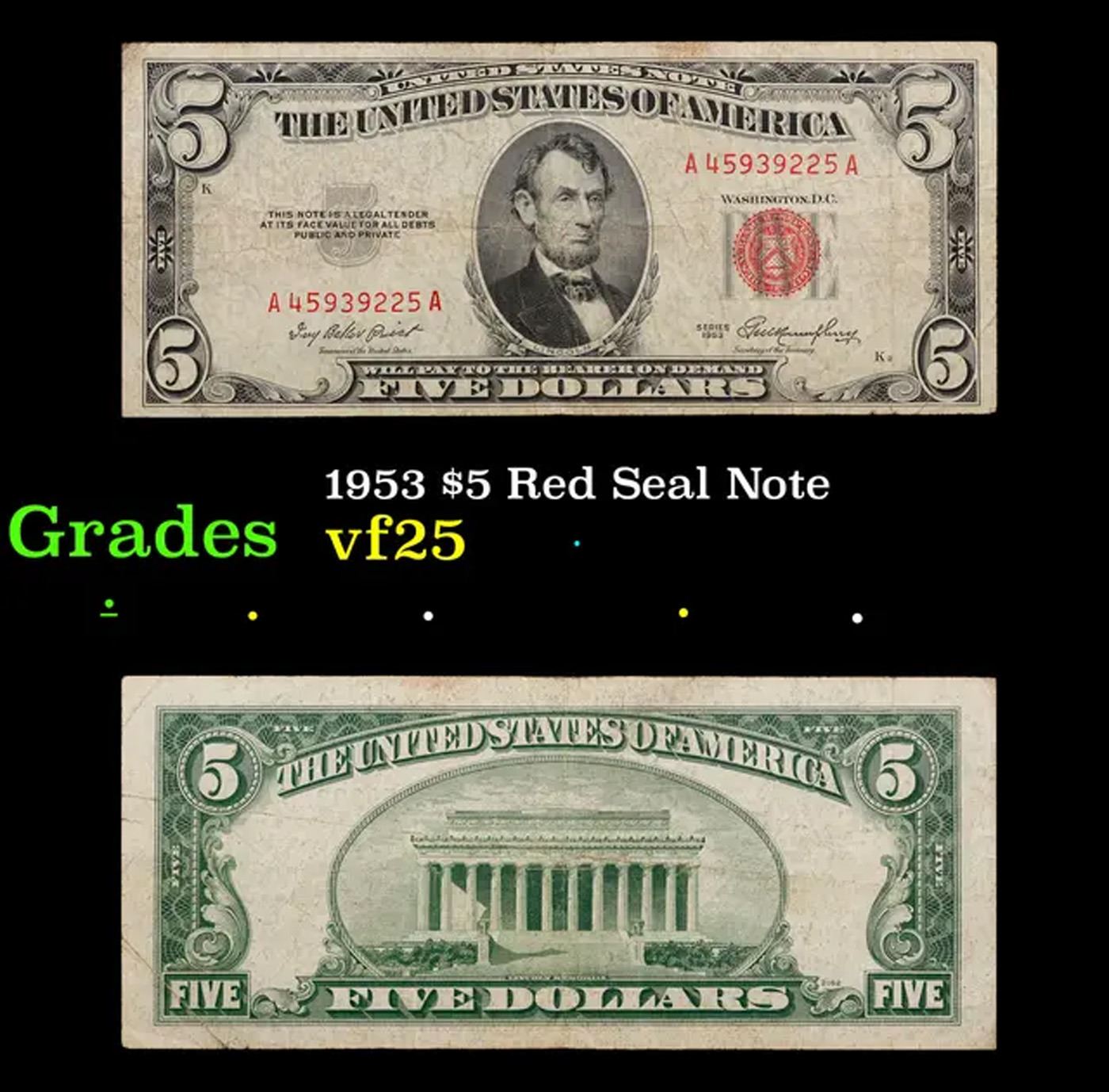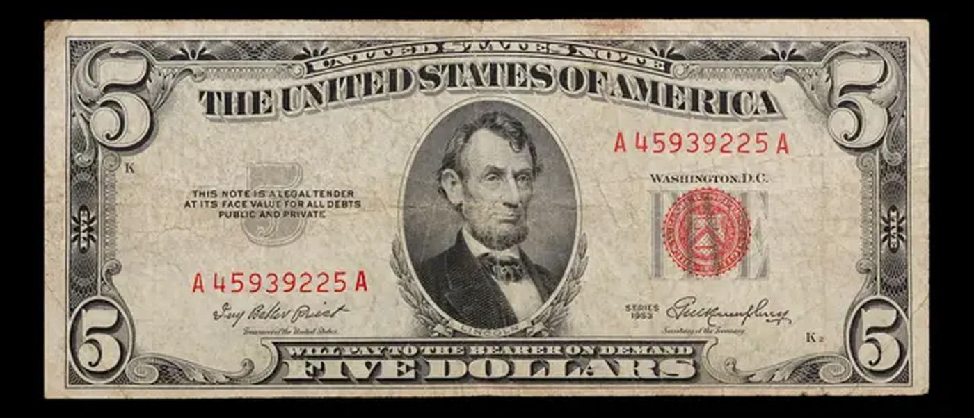 1953 $5 Red Seal Note Grades vf+.