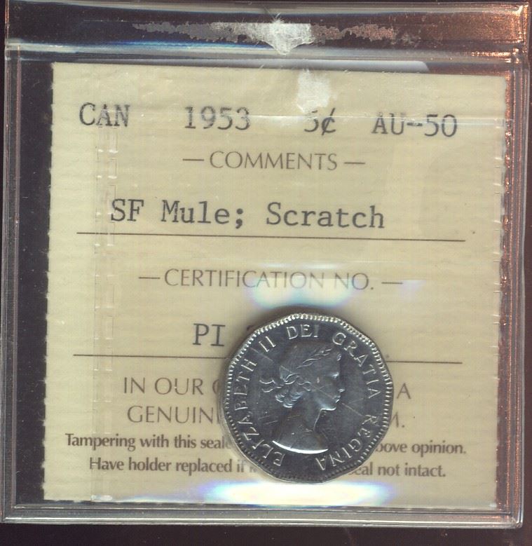 1953 5¢ SF Mule ICCS AU50. Scratch designation.