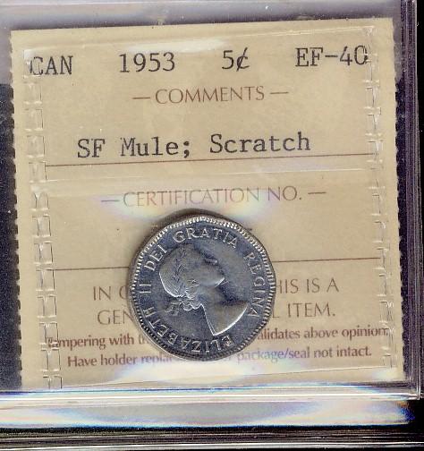 1953 5¢ SF Mule ICCS EF40. Typical look with scratch.