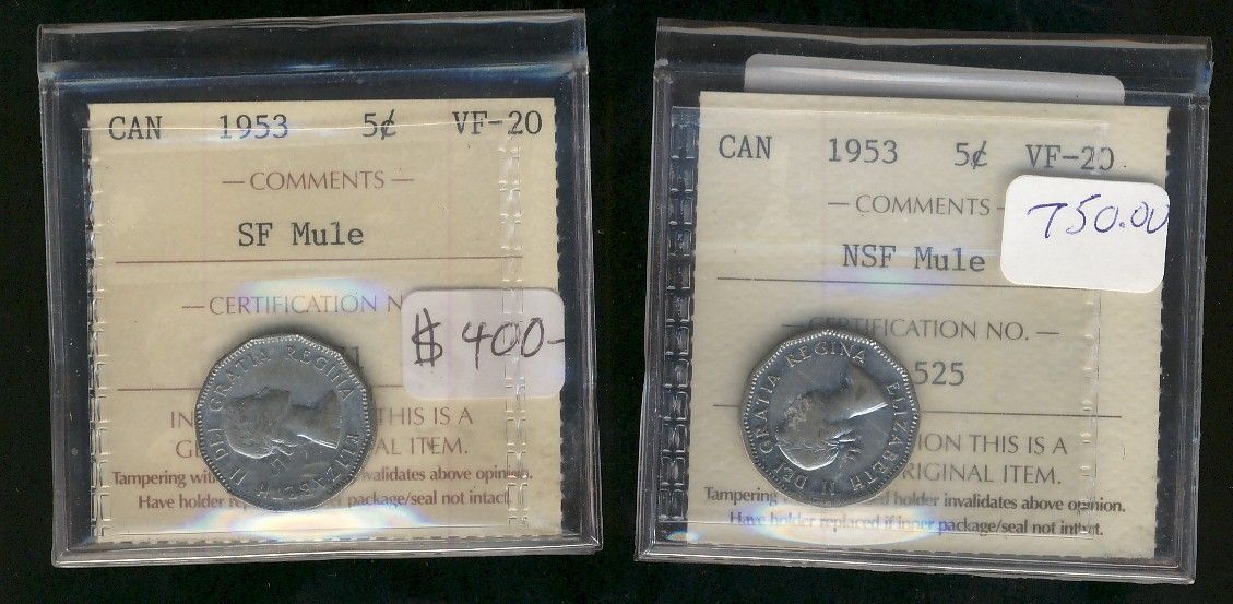 1953 5¢ SF & NSF Mules ICCS VF20.  Lot of 2 coins.  Rarely offered as a pair.