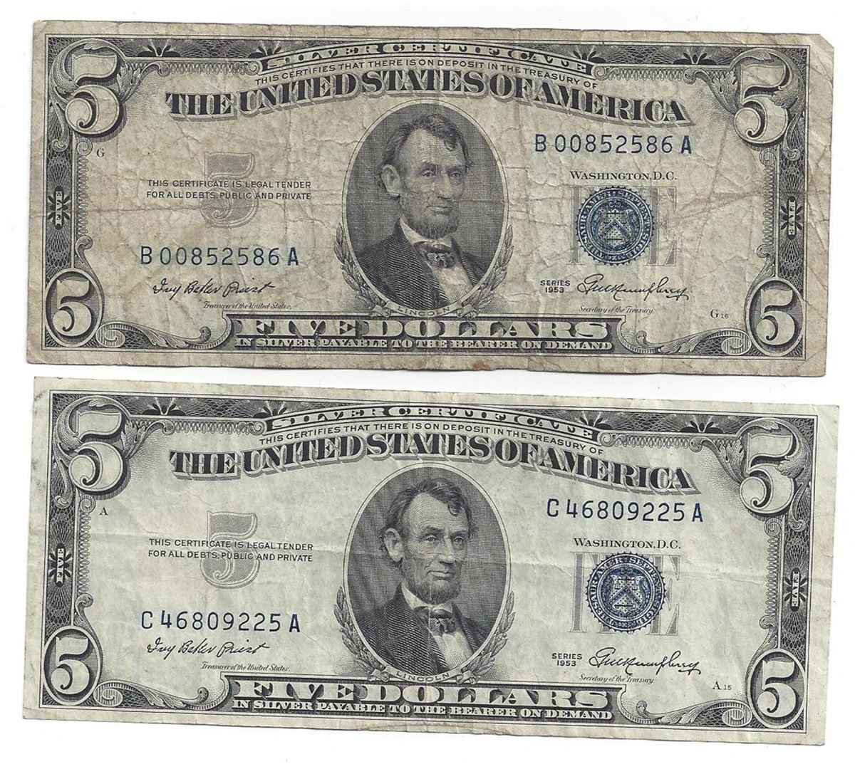 1953 $5 Silver Certificate Currency Lot of 2.
