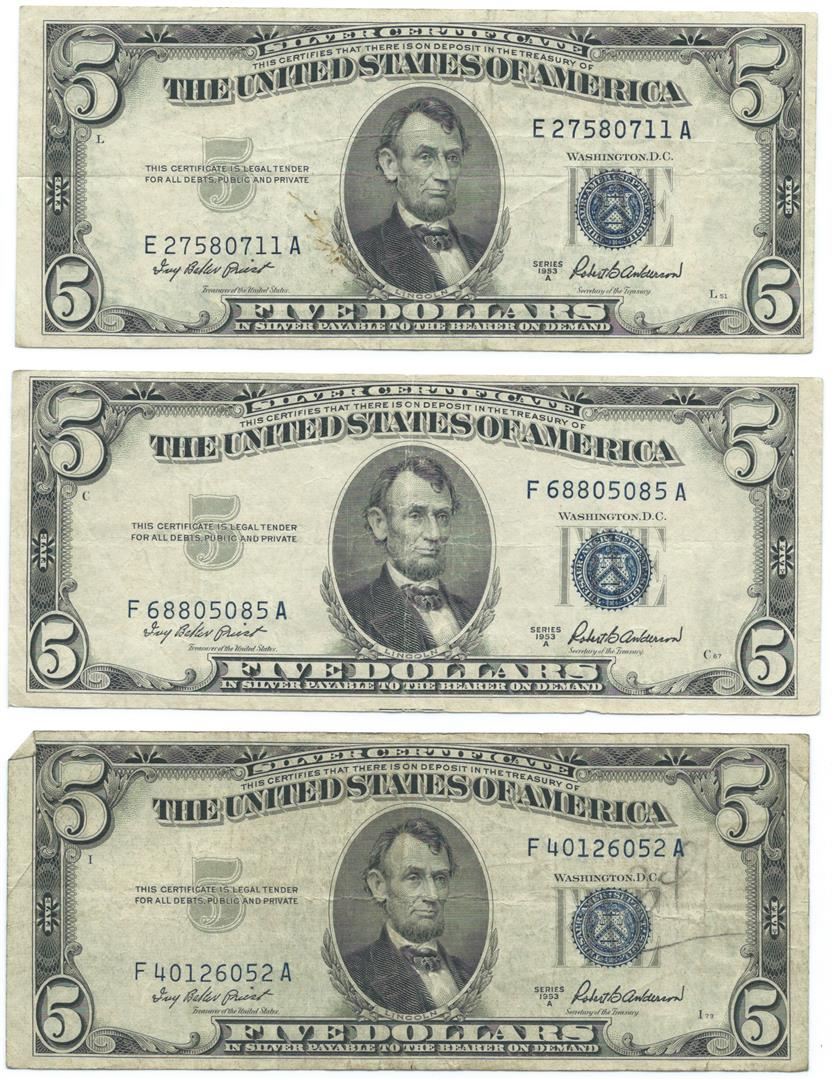 One 1953 $5 Silver Certificate Currency Lot of 3.