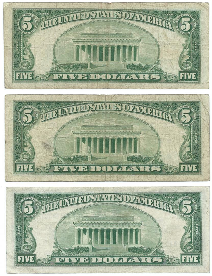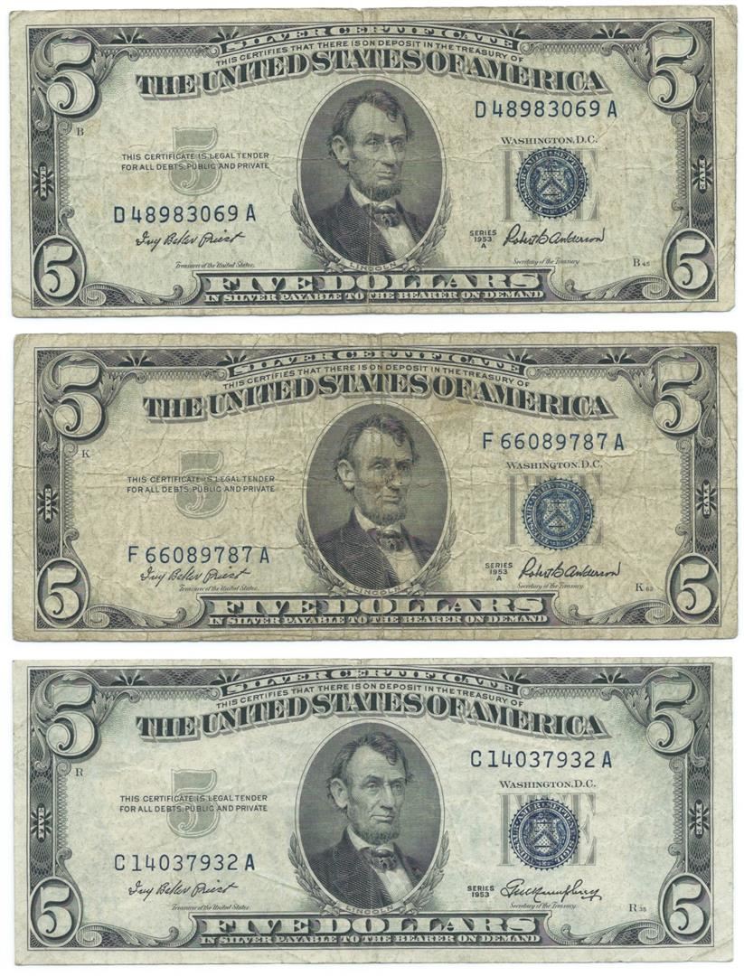 One 1953 $5 Silver Certificate Currency Lot of 3.