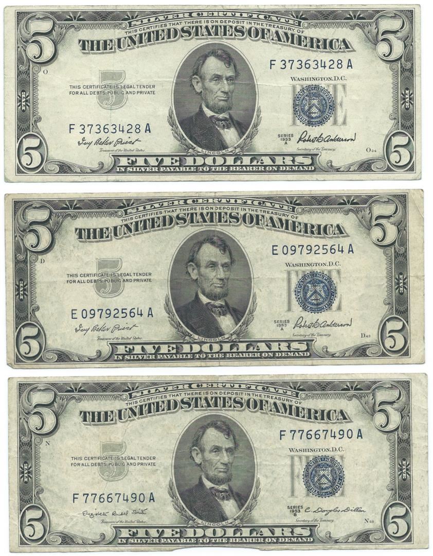 One 1953 $5 Silver Certificate Currency Lot of 3.