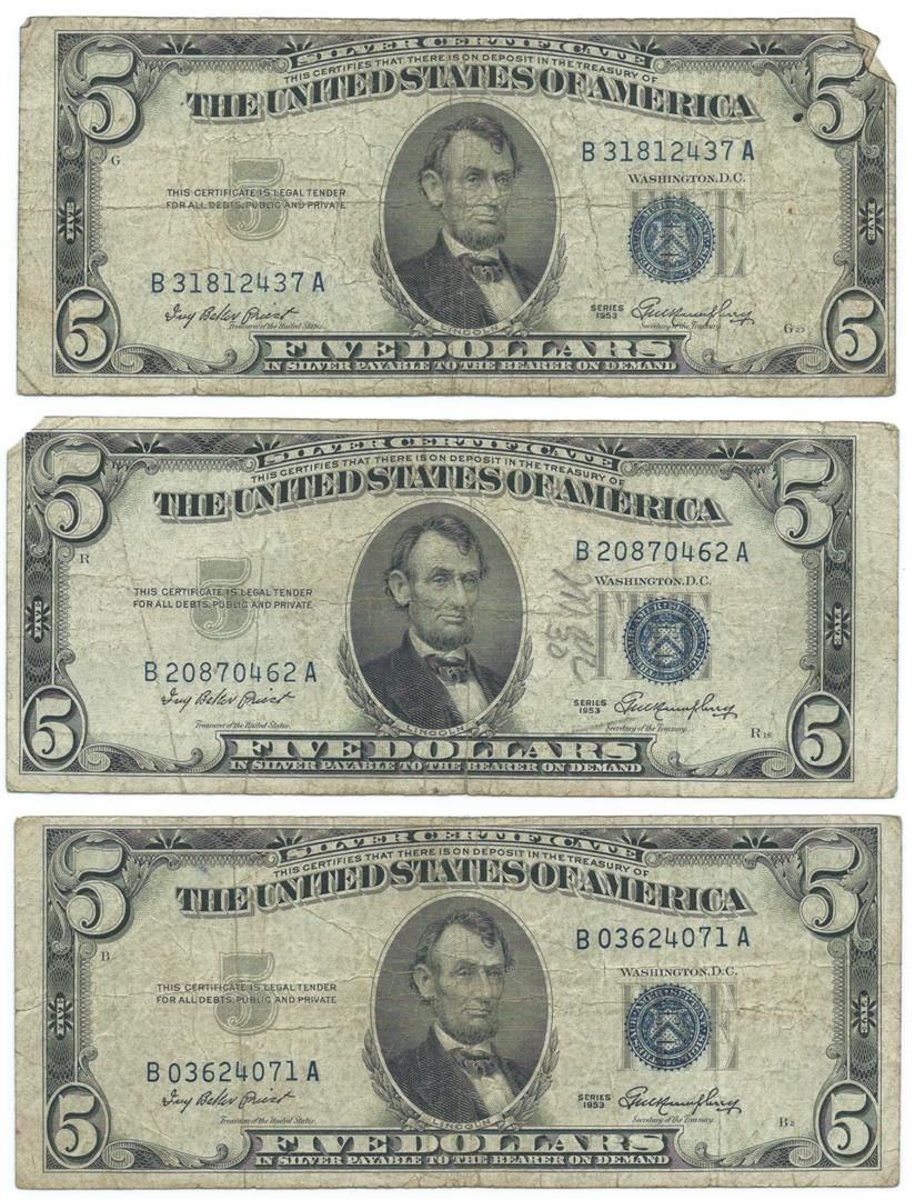 One 1953 $5 Silver Certificate Currency Lot of 3.