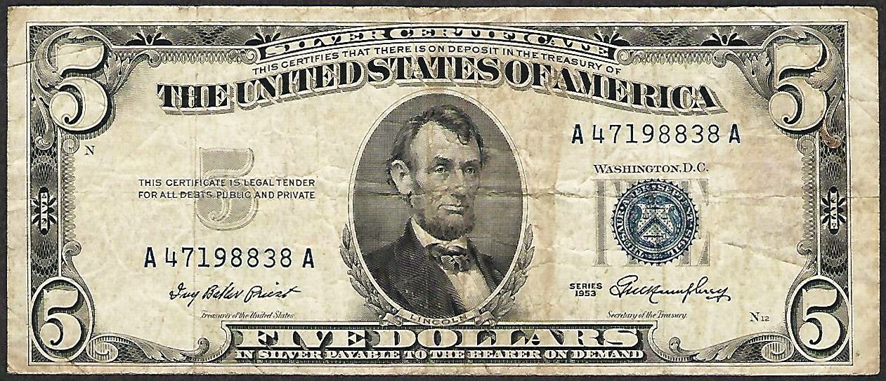 One 1953 $5 Silver Certificate Faulty Alignment ERROR Note.