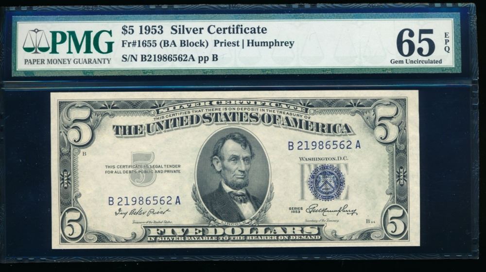 One 1953 $5 Silver Certificate PMG 65EPQ.