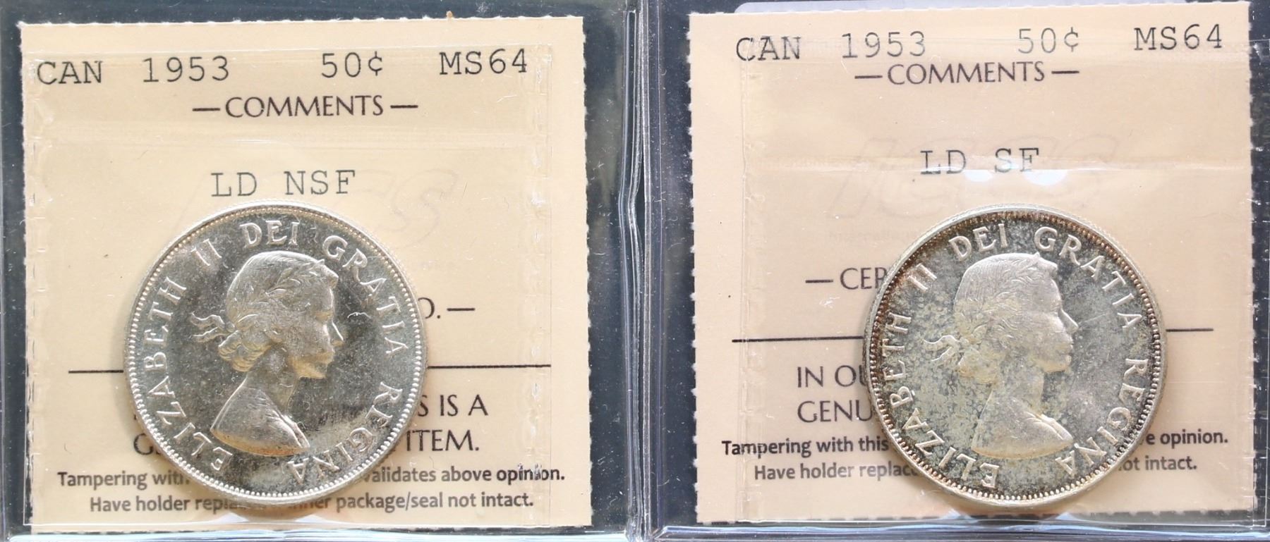 1953 50¢ LD NSF & 1953 LD SF, both coins ICCS Choice Mint State-64.