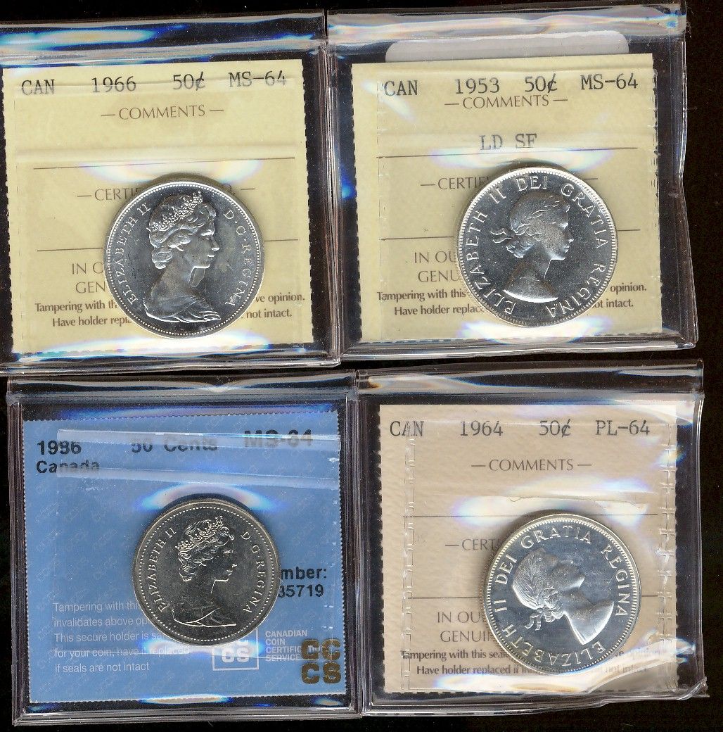 1953 50¢ LD SF & 1966 ICCS MS64 along with 1964 ICCS PL64 & 1986 Nickel CCCS MS64. Lot of 4 coins.