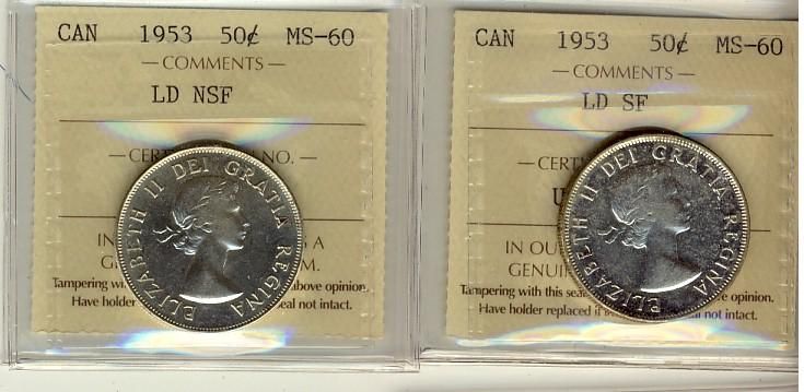 1953 50¢ LD SF & LD NSF ICCS MS60. Lot of 2 coins.