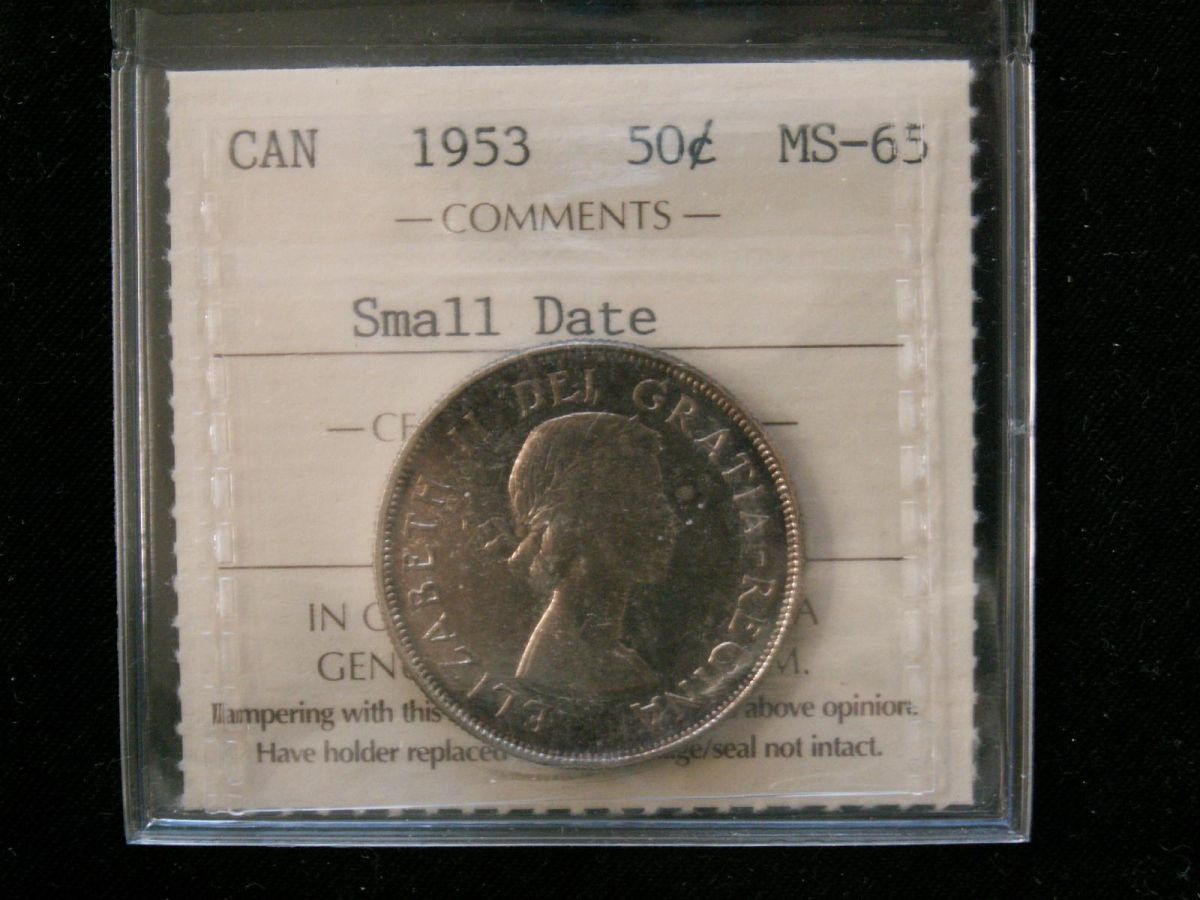 1953 50¢ SmDate ICCS MS65. Light brown haze toning.