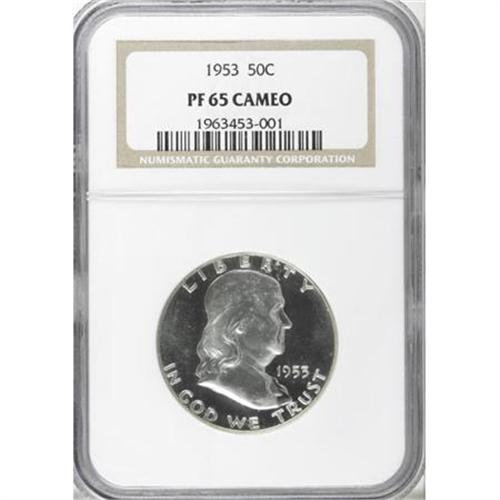 <B>1953 50C PR65 Cameo NGC.</B></I> NGC Census: (286/484). PCGS Population (135/262). Numismedia Wsl. Price for NGC/PCGS coin in PR65: $250. (#86694)<BR><BR><b>Shipping:</b> Coins & Currency (<a target="_blank" href="http://www.heritageauctions.com/common/shipping.php">view shipping information</a>)