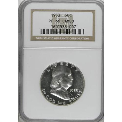 <B>1953 50C PR66 Cameo NGC.</B></I> NGC Census: (322/154). PCGS Population (174/84). Numismedia Wsl. Price for NGC/PCGS coin in PR66: $480. (#86694)<BR><BR><b>Shipping:</b> Coins & Currency (<a target="_blank" href="http://www.heritageauctions.com/common/shipping.php">view shipping information</a>)