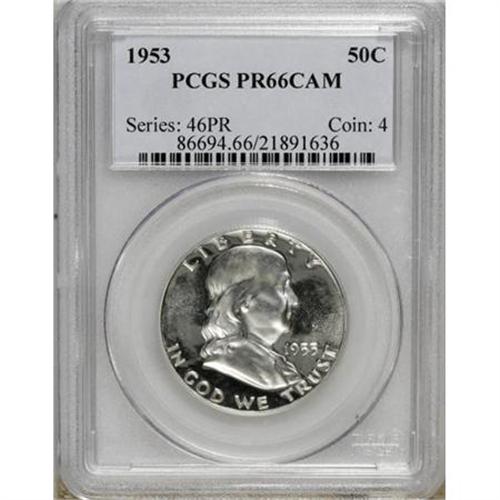 <B>1953 50C PR66 Cameo PCGS.</B></I> . PCGS Population (177/85). NGC Census: (324/162). Numismedia Wsl. Price for NGC/PCGS coin in PR66: $400. (#86694)<BR><BR><b>Shipping:</b> Coins & Currency (<a target="_blank" href="http://www.heritageauctions.com/common/shipping.php">view shipping information</a>)