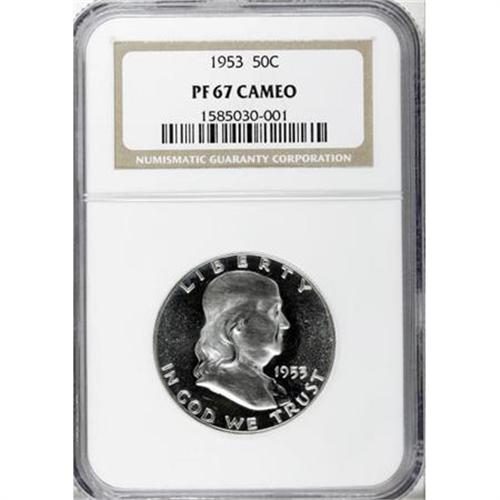 <B>1953 50C PR67 Cameo NGC.</B></I> NGC Census: (142/19). PCGS Population (82/3). Numismedia Wsl. Price for NGC/PCGS coin in PR67: $1,000. (#86694)<BR><BR><b>Shipping:</b> Coins & Currency (<a target="_blank" href="http://www.heritageauctions.com/common/shipping.php">view shipping information</a>)