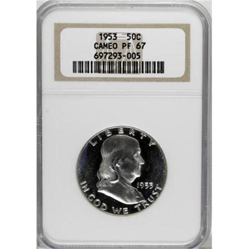 <B>1953 50C PR67 Cameo NGC.</B></I> . NGC Census: (143/19). PCGS Population (82/3). Numismedia Wsl. Price for NGC/PCGS coin in PR67: $1,000. (#86694)<BR><BR><b>Shipping:</b> Coins & Currency (<a target="_blank" href="http://www.heritageauctions.com/common/shipping.php">view shipping information</a>)