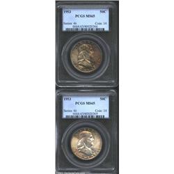 1953 50C MS65 PCGS, two examples, both displaying similar toning schemes with splashes of copper-russet patina over otherwise silver-gray features. A frosty textured duo. 2 pieces Important notice: We expect to be auctioning lots at the rate of 200-250 per hour. Sometimes eBay Premier live bid software cannot keep up with that pace, so we strongly recommend that you place a realistic proxy bid now as insurance to avoid disappointment. Also please note that all Heritage/CAA lots purchased through eBay Premier carry a 20% Buyer's Premium. Please make sure you read the Terms and Conditions.