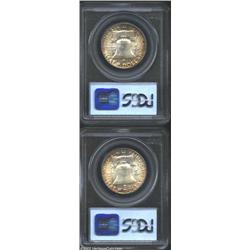 1953 50C MS65 PCGS, two examples, both displaying similar toning schemes with splashes of copper-rus